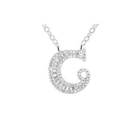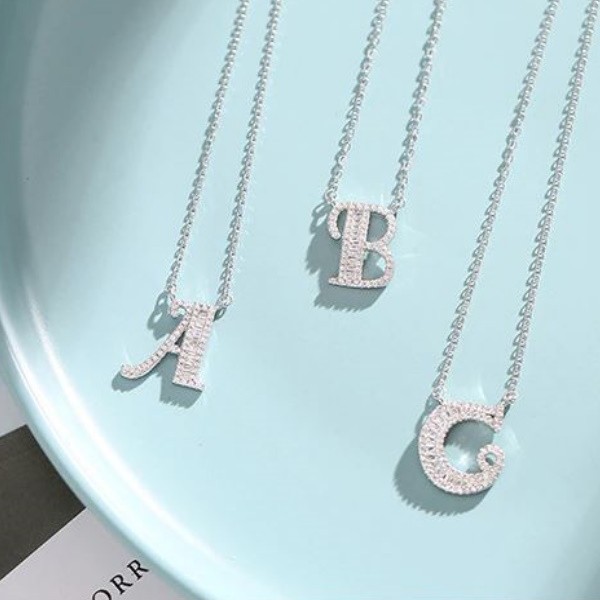Náhrdelník vyrobený zo striebra, s príveskom zdobeným bielym zirkónovým kryštálom, tvoriacim písmeno. Hmotnosť 4 g.