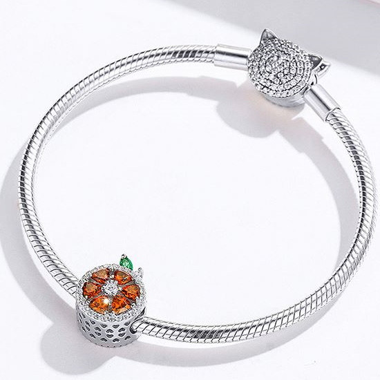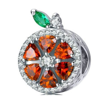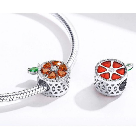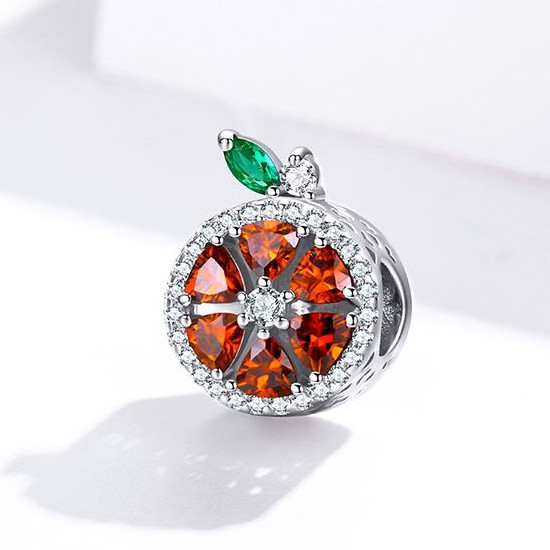 Strieborný prívesok v tvare grapefruitu zdobený zirkónovým kryštálom. Dá sa navliecť na náramok alebo náhrdelník. Veľkosť 1,5 x 1,1 cm, hmotnosť cca. 2,4 g.
