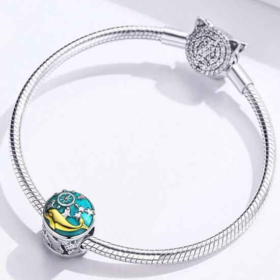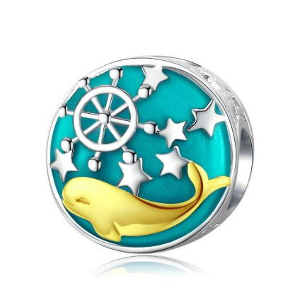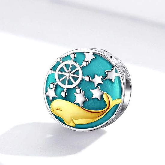 Vyrobený zo striebra, ozdobený veľrybou potiahnutou platinou. Dá sa nosiť na náramku alebo náhrdelníku. Veľkosť 1,1 x 1 cm. Hmotnosť cca. 2 g.
