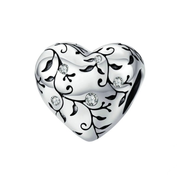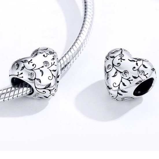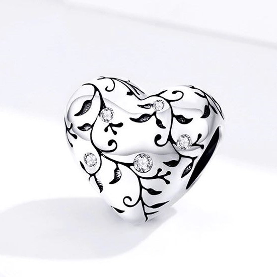 Prívesok v tvare srdca zo striebra, s krásne prepracovaným indigovým vzorom, zdobený zirkónovým kryštálom. Dá sa nosiť na náramku alebo náhrdelníku. Veľkosť 1,1 x 1,1 cm, hmotnosť cca. 1,9 g.