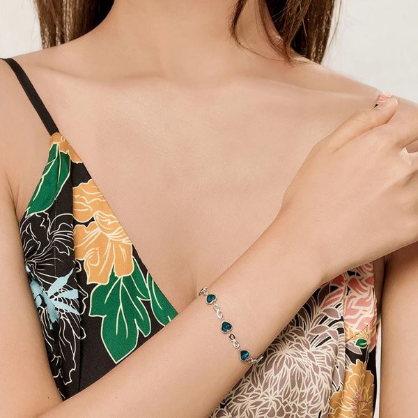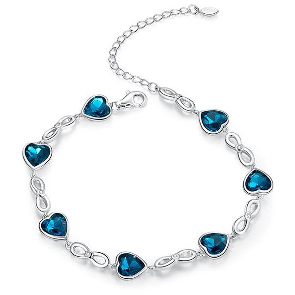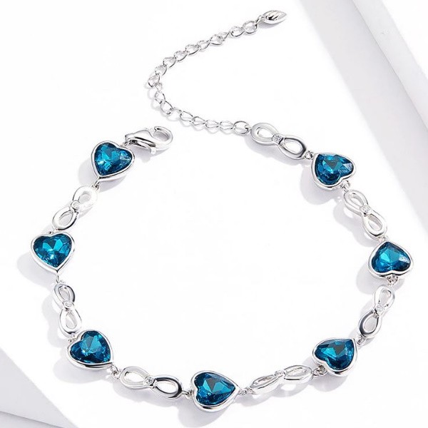 Náramok vyrobený zo striebra, zdobený modrými krištáľovými srdiečkami. Dĺžka 15-20 cm, hmotnosť cca. 6,3 g.