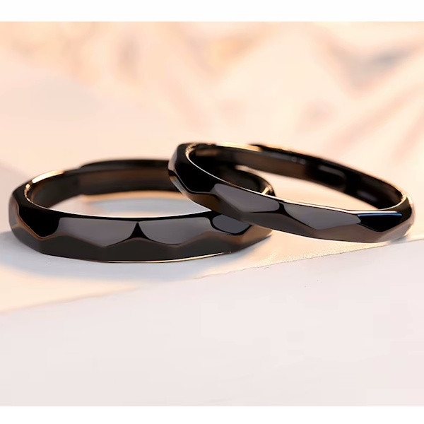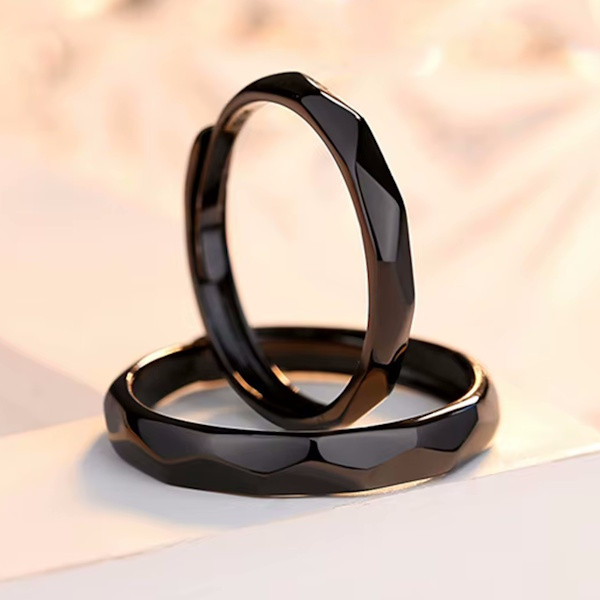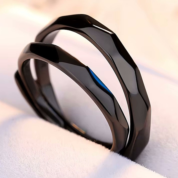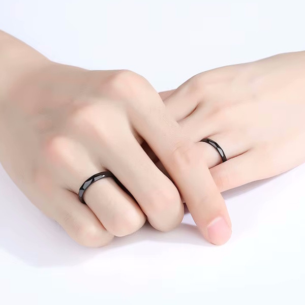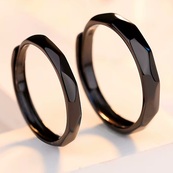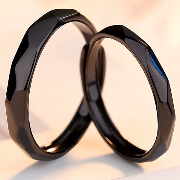 Ezüstből készült karikagyűrű fekete színben. A női gyűrű mérete 5-8, szélessége 3 mm. A férfigyűrű mérete 7-10.5, szélessége 4 mm.