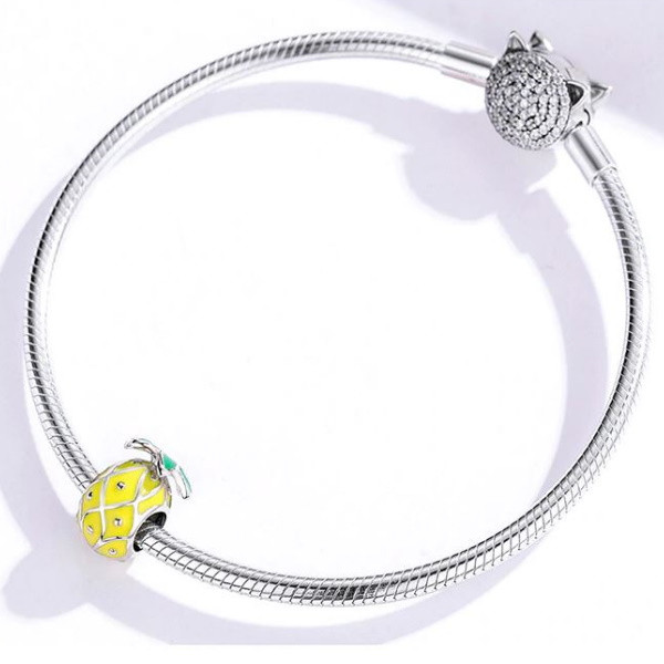 Vyrobený zo striebra, prívesok v tvare ananásu zdobený zirkónovým kryštálom. Dá sa nosiť na náhrdelníku alebo náramku. Veľkosť 1,2 x 0,9 cm.