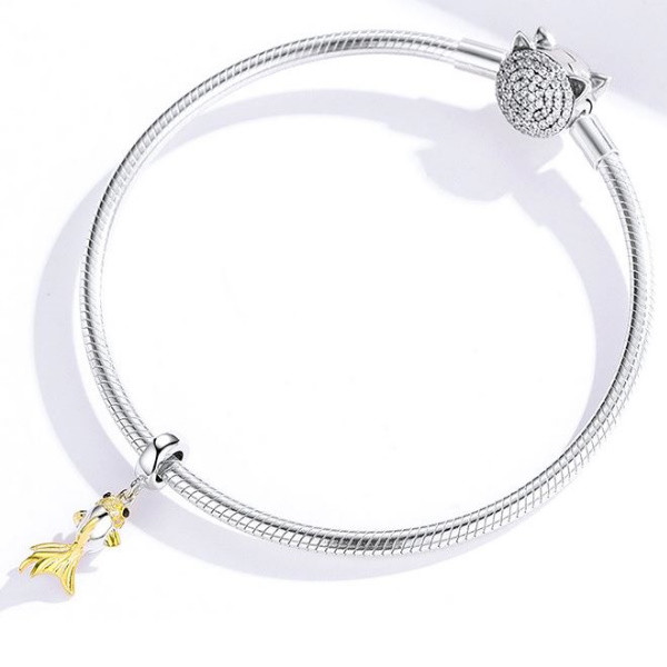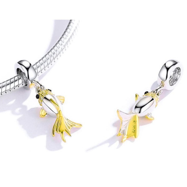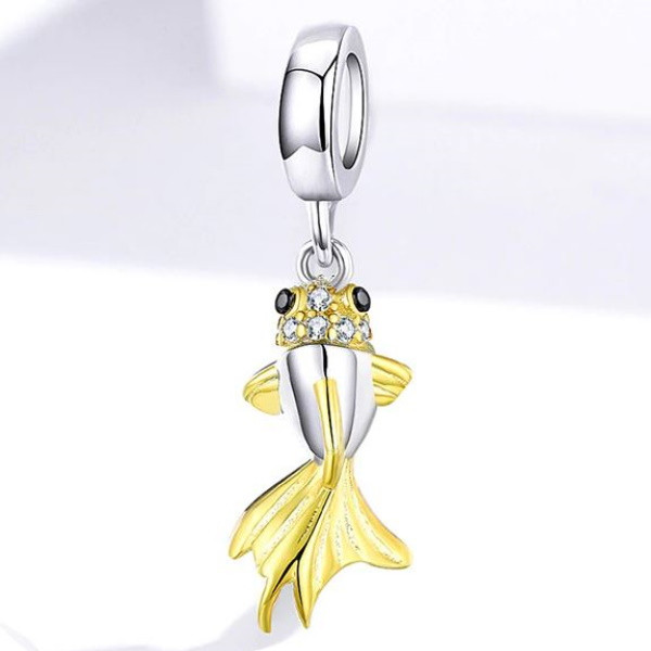 Prívesok s vyobrazením zlatej rybky vyrobený zo striebra, zdobený zirkónovým kryštálom. Dá sa nosiť na náhrdelníku alebo náramku. Veľkosť 2,4 x 0,8 cm.