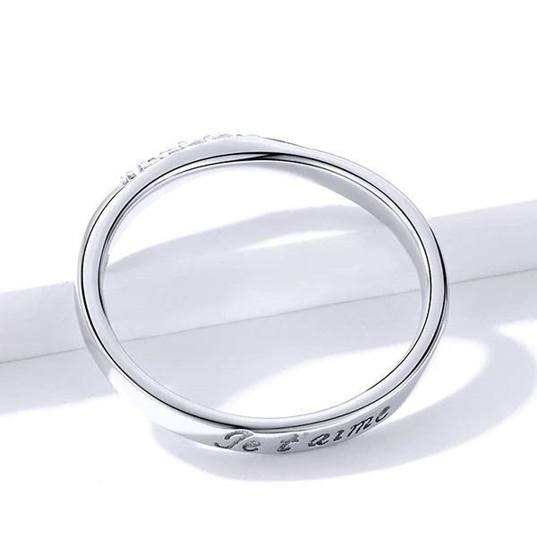 Elegantný, tenký prsteň zo striebra, zdobený kryštálmi zirkónu, s nápisom "Je t'aime". Šírka 0,2 cm, váha 1,7 g.