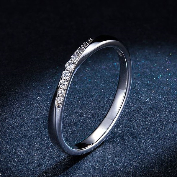 Elegantný tenký prsteň zo striebra, zdobený kryštálmi zirkónu, s nápisom "Je t'aime". Šírka 0,2 cm, váha 1,7 g.