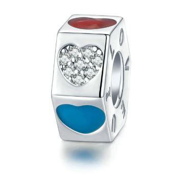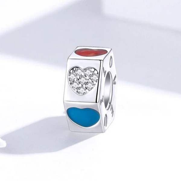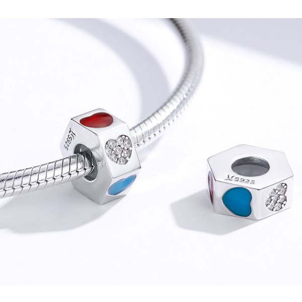 Vyrobené zo striebra, trojfarebné kúzlo na náhrdelník a náramok. Zdobený je srdiečkami a zirkónovým kryštálom, rozmer 1 x 1 cm.