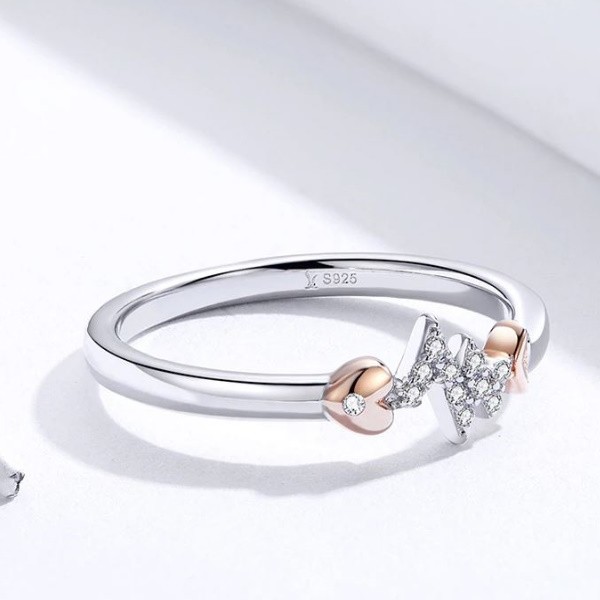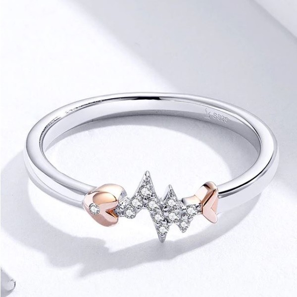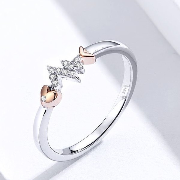 Dámsky prsteň zo striebra s figúrkou rybej kosti zdobený ružovým zlatom a zirkónovým kryštálom. Hrúbka 0,2 cm, váha 1,7 g.