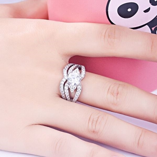 Dvojitý zásnubný prsteň vyrobený zo striebra zdobený bielym zirkónovým kryštálom. Šírka 2 cm, váha 5,7 g.