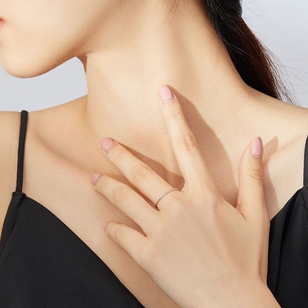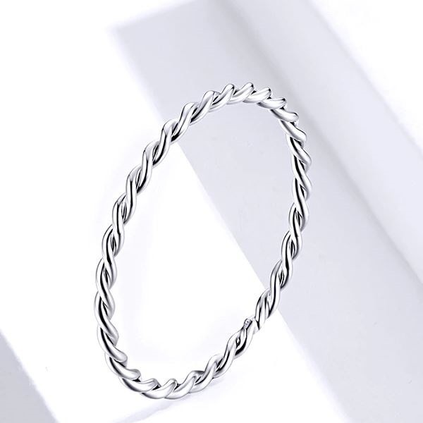 Jednoduchý, tenký strieborný prsteň so zapleteným efektom s platinovým povlakom. Hrúbka 0,1 cm, váha 0,4 g.