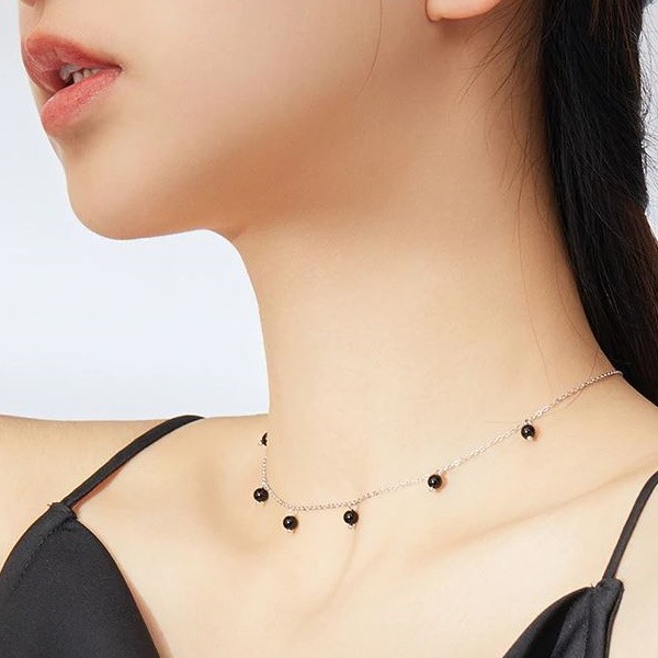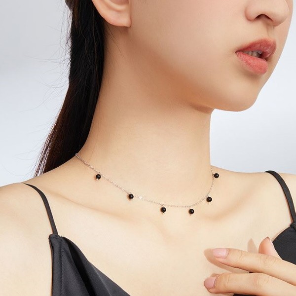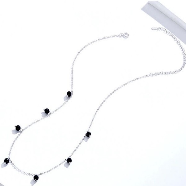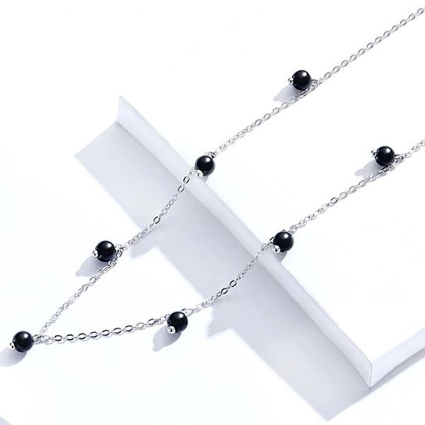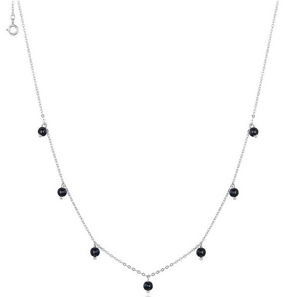 Strieborný náhrdelník s čiernymi syntetickými kremennými perlami. Dĺžka retiazky je 40-45 cm, váha 2,2 gramu.