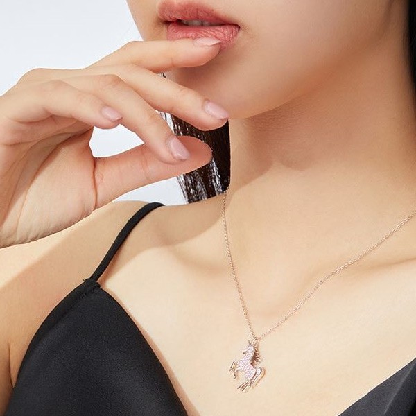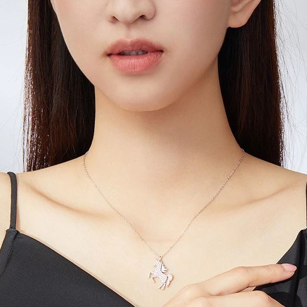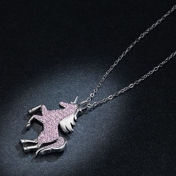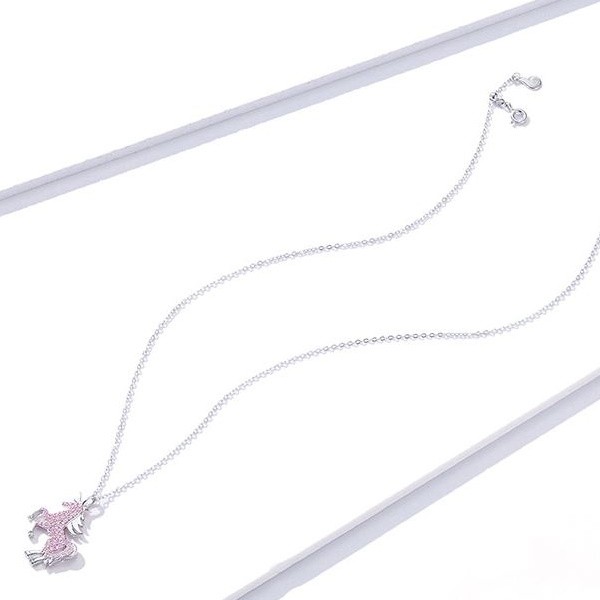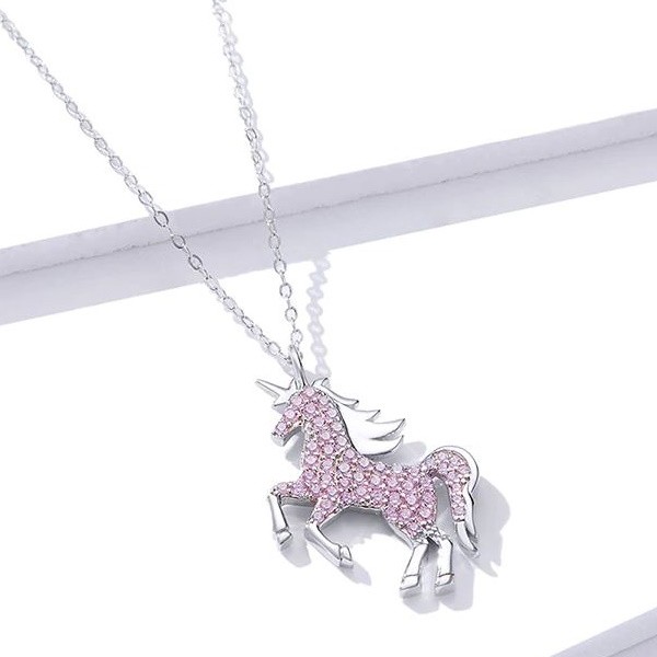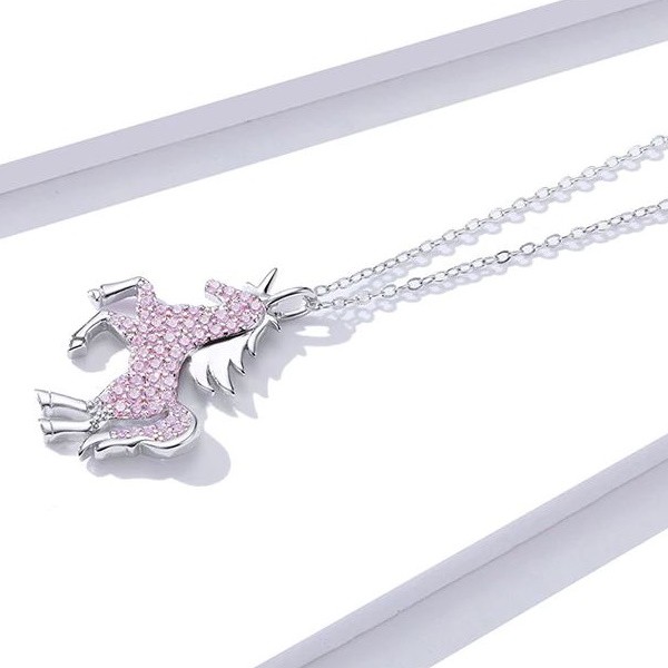 Náhrdelník vyrobený zo striebra, zdobený ružovým zirkónovým kryštálom, s príveskom jednorožca. Dĺžka retiazky je 40-45 cm, váha 3,4 g.