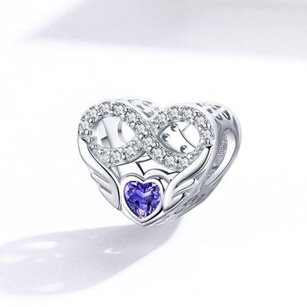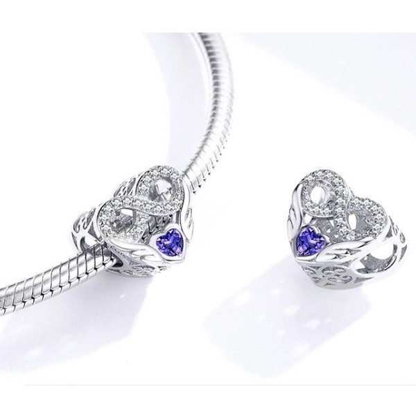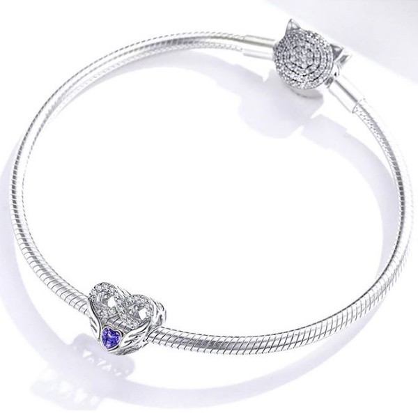 Platinované strieborné srdiečko zdobené zirkónovým kryštálom a modrým skleneným srdiečkom. Dá sa nosiť na náhrdelníku alebo náramku. Veľkosť 1,0 x 1,2, hmotnosť cca. 2,0 gramu.