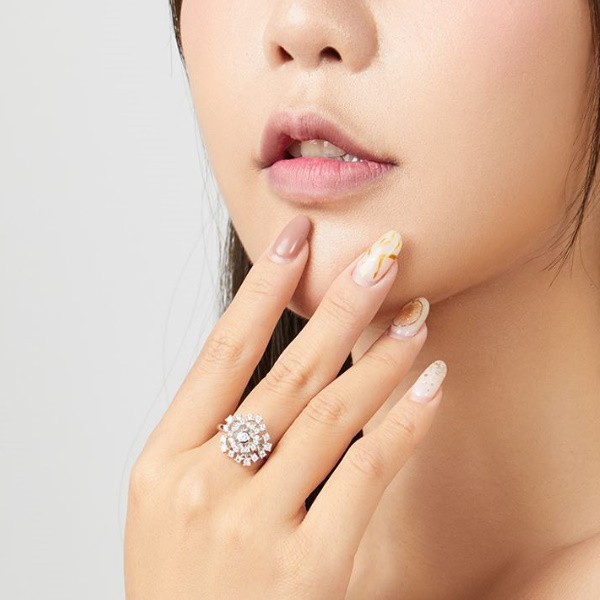 Filigránový strieborný prsteň zdobený bielym zirkónovým kryštálom v tvare kvetu s platinovým povlakom. Jeho šírka je 0,2 cm, váha 2,6 gramu.