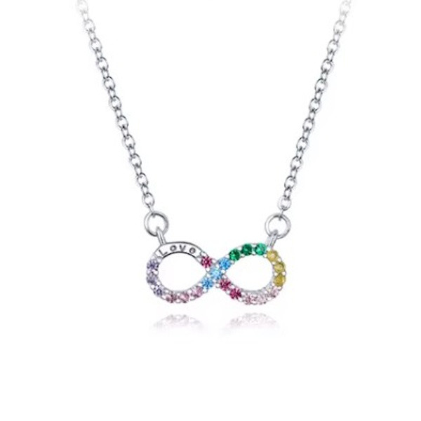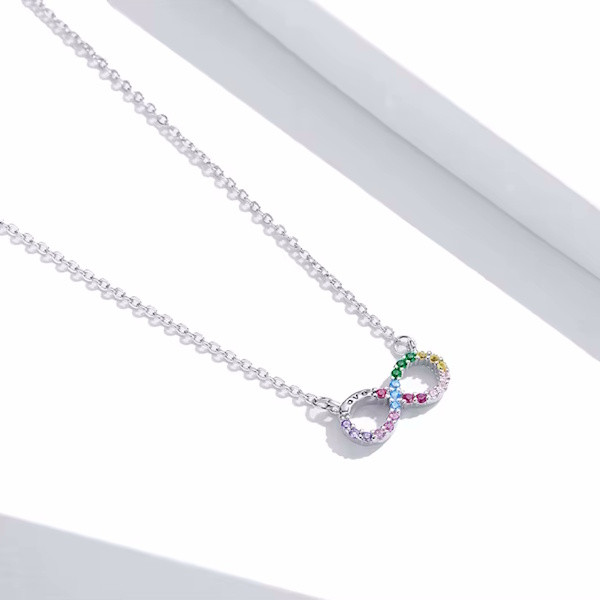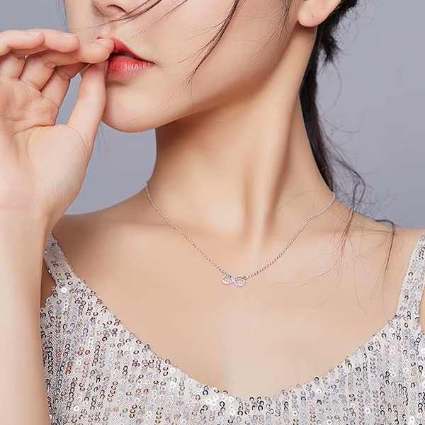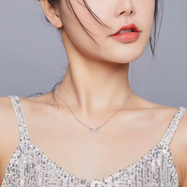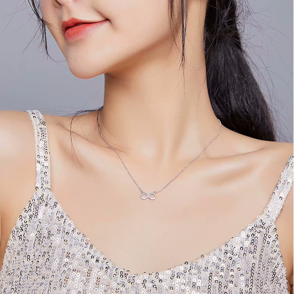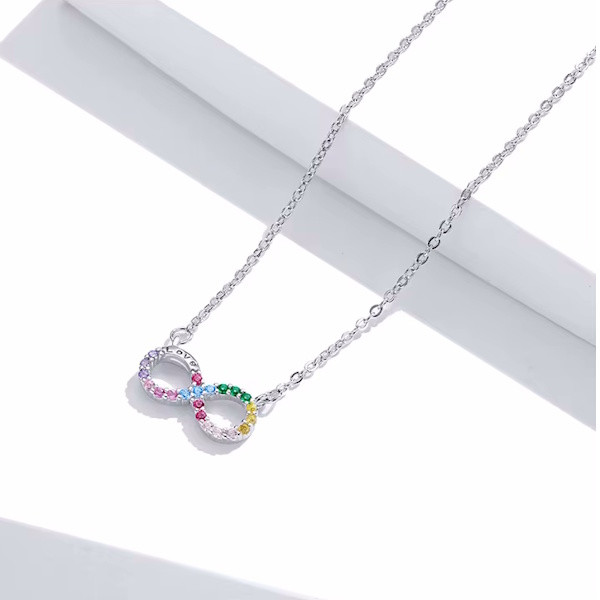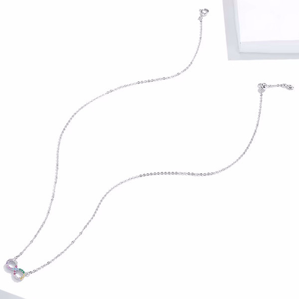 Ez a gyönyörű, 925 sterling ezüstből készült nyaklánc a végtelenszimbólummal nemcsak eleganciát, hanem mély jelentéssel bíró üzenetet is hordoz. A platina bevonat fényes ragyogása és a színes cirkóniumkristályok csillogása teszi igazán különlegessé ezt a 45 cm hosszú, könnyed viseletű ékszert. A végtelenszimbólum a soha véget nem érő szeretet és hűség jelképe, ezért tökéletes ajándék lehet szeretteid számára. Különleges alkalmakkor is biztos társad lesz, hiszen nemcsak a stílusod, hanem az érzelmeid kifejezését is támogatja. Könnyű súlyának köszönhetően kényelmes viselet a mindennapokban, így nemcsak különleges eseményeken, hanem bármikor viselheted. Lepd meg magad vagy valakit, aki fontos számodra, ezzel az időtlen szépségű nyaklánccal!