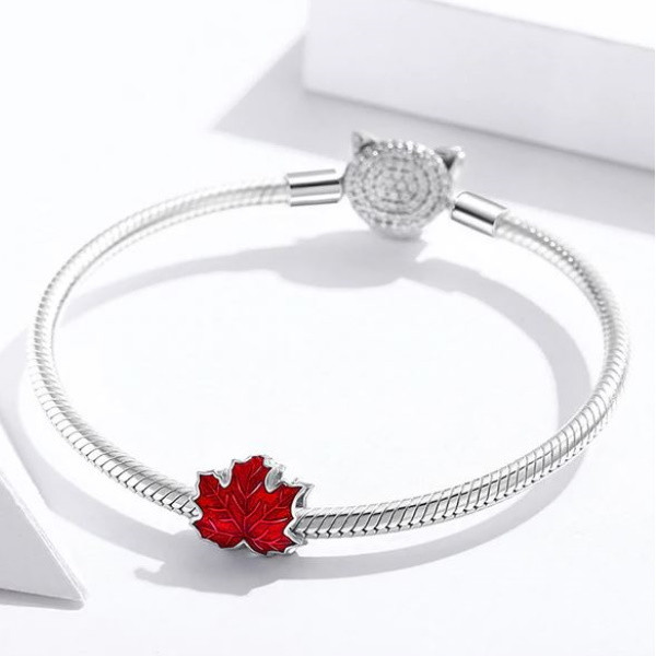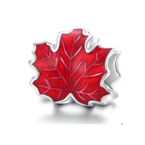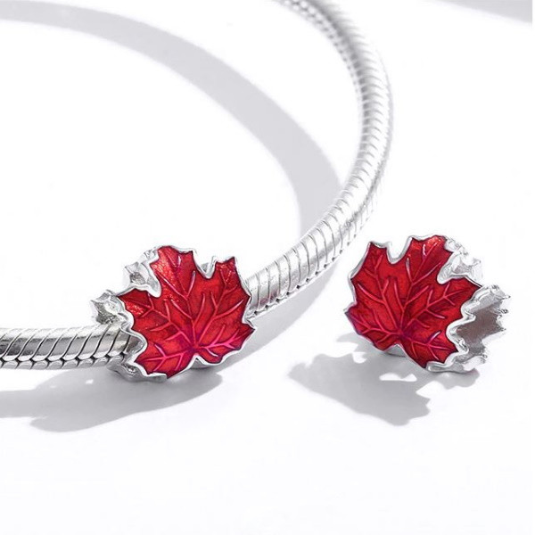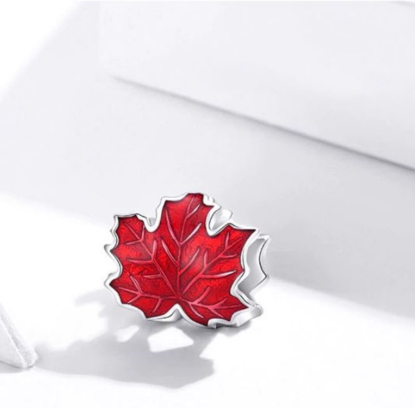 Strieborný prívesok zobrazujúci červený javorový list na náhrdelníky a náramky. Veľkosť 0,9 x 1,1 cm, hmotnosť cca. 1,4 g.