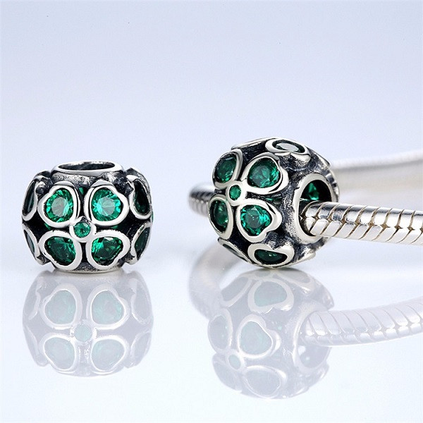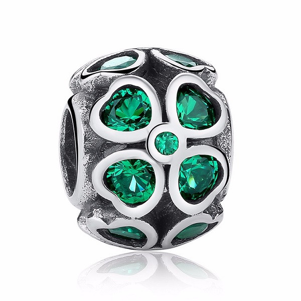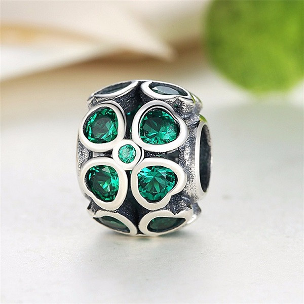 Vyrobené zo striebra, zdobené zeleným zirkónovým kryštálom, na ozdobný náramok a náhrdelník. Hmotnosť 2,7 g Prívesok je kompatibilný s náramkami typu Pandora a Pandora.