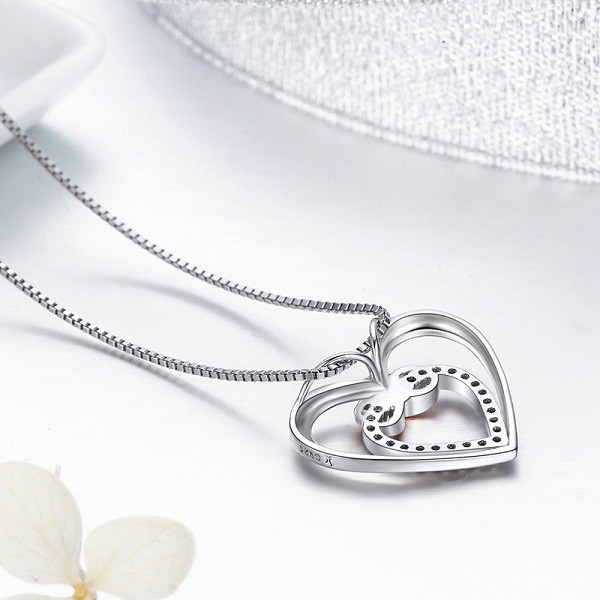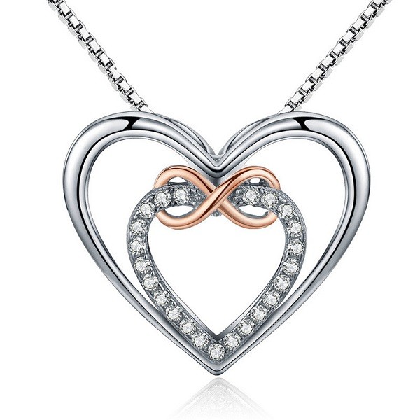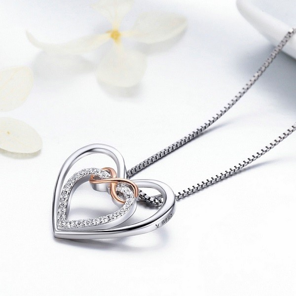 Strieborný náhrdelník s príveskom. Prívesok tvoria dve srdiečka so symbolom nekonečna, jedno srdiečko zdobí biely zirkónový kryštál. Dĺžka retiazky je nastaviteľná do 45 cm, jej váha je 4 g. Veľkosť prívesku je 2 x 1,8 cm.