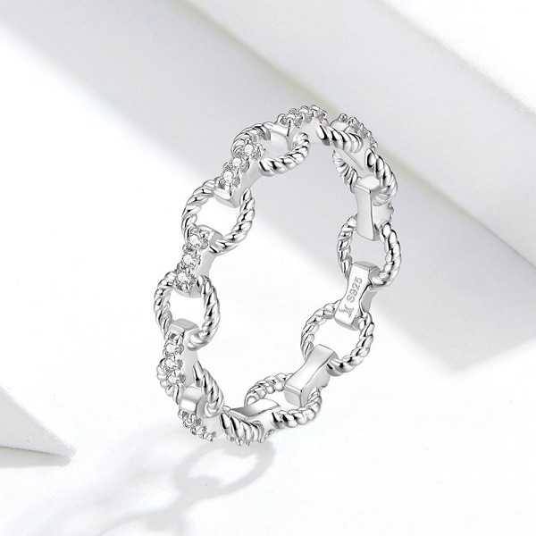 Dámsky prsteň vyrobený zo striebra, imitujúci retiazku, zdobený bielym zirkónovým kryštálom. Jeho šírka je 0,4 cm, hmotnosť 1,7 g.