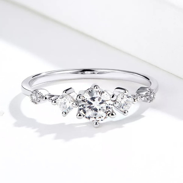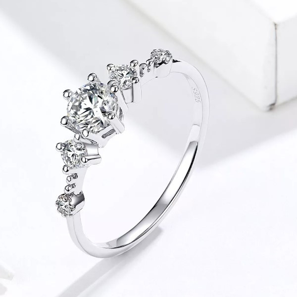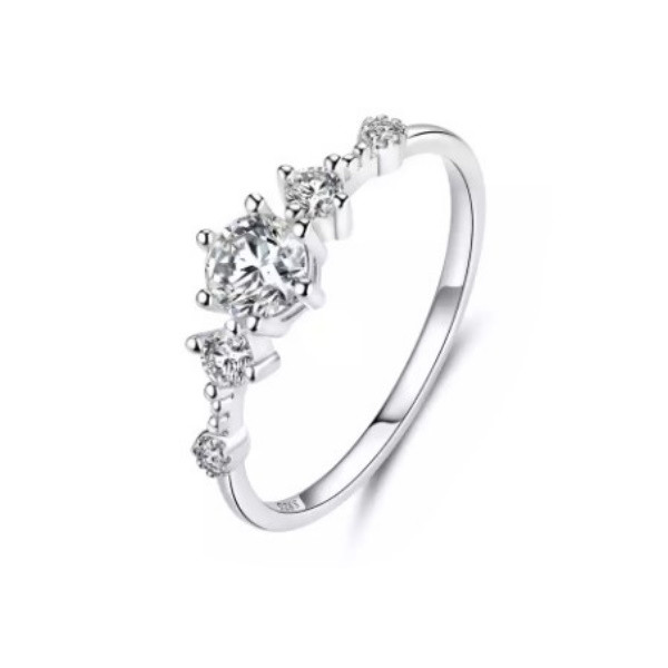 Dámsky zásnubný prsteň vyrobený zo striebra zdobený bielym zirkónovým kryštálom. Jeho hrúbka je 0,15 cm, hmotnosť 1,3 g.