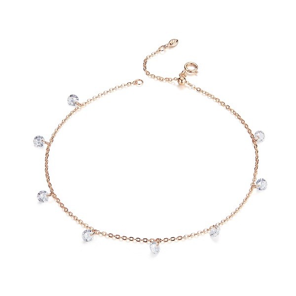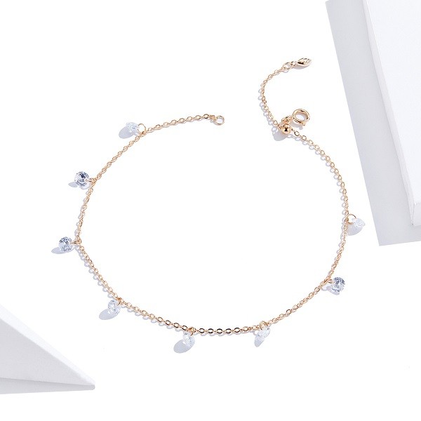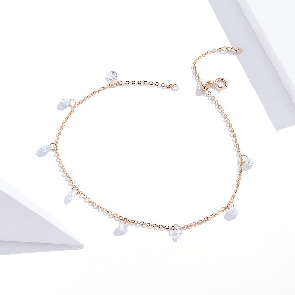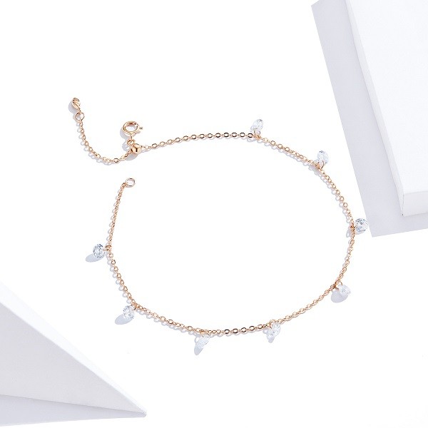 Náramok vyrobený zo striebra, zdobený korálkami z kryštálu zirkónu, s ružovým zlatom. Dĺžka 23 cm, váha 1,6 g.