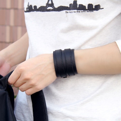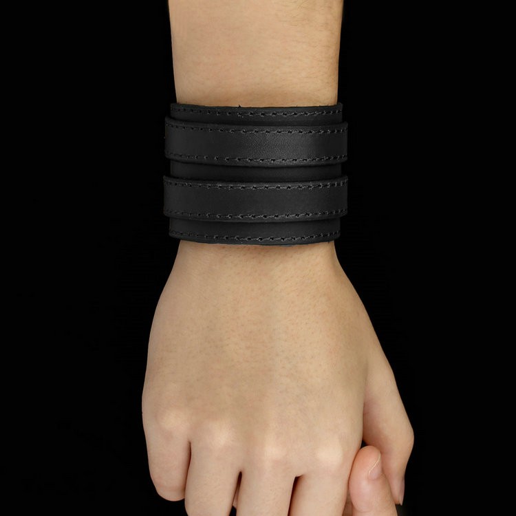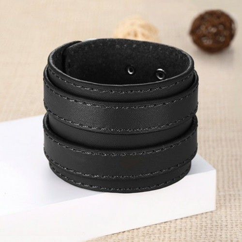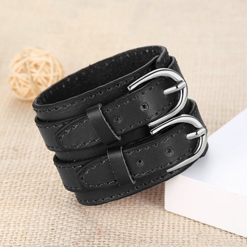 Široký punkový náramok, kožený, čierny, s dvojitou prackou