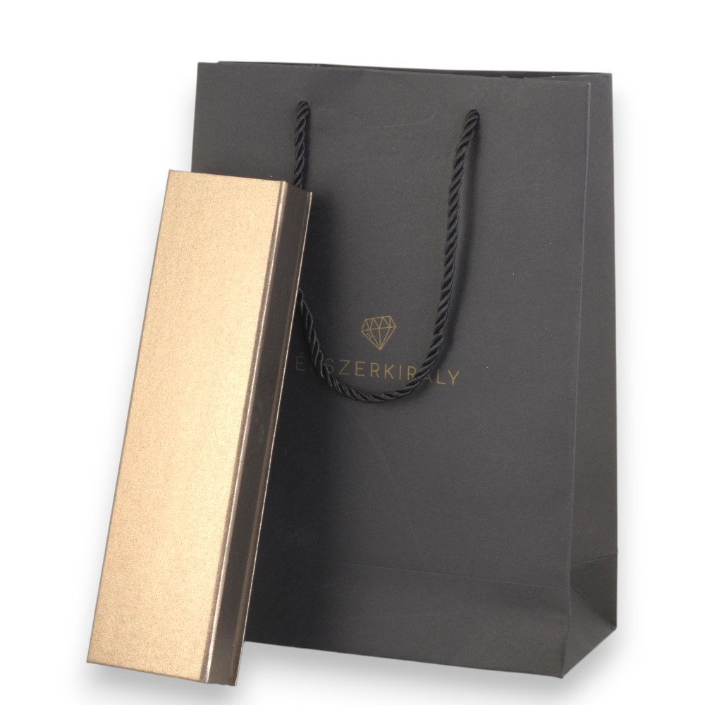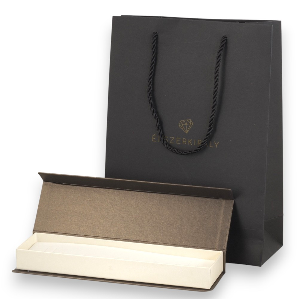 Díszcsomagolás kifejezetten karláncok, nyakláncok, bokaláncok részére – hogy az ajándékozás valóban teljes élményt nyújtson. A szett tartalmaz 1 db elegáns dísztáskát és 1 db hosszú, aranyszínű tetővel ellátott ékszerdobozt.Mindkét darab aranyszínű Ékszerkirály logóval díszített, így már első pillantásra prémium hatást kelt. Egy szépen kiválasztott ékszer önmagában is értékes, de a megfelelő díszcsomagolás teszi igazán ünnepivé és emlékezetessé az átadást. Ne adja át ajándékát enélkül – ezzel a csomagolással válik teljessé a meglepetés és maradandóvá az élmény.