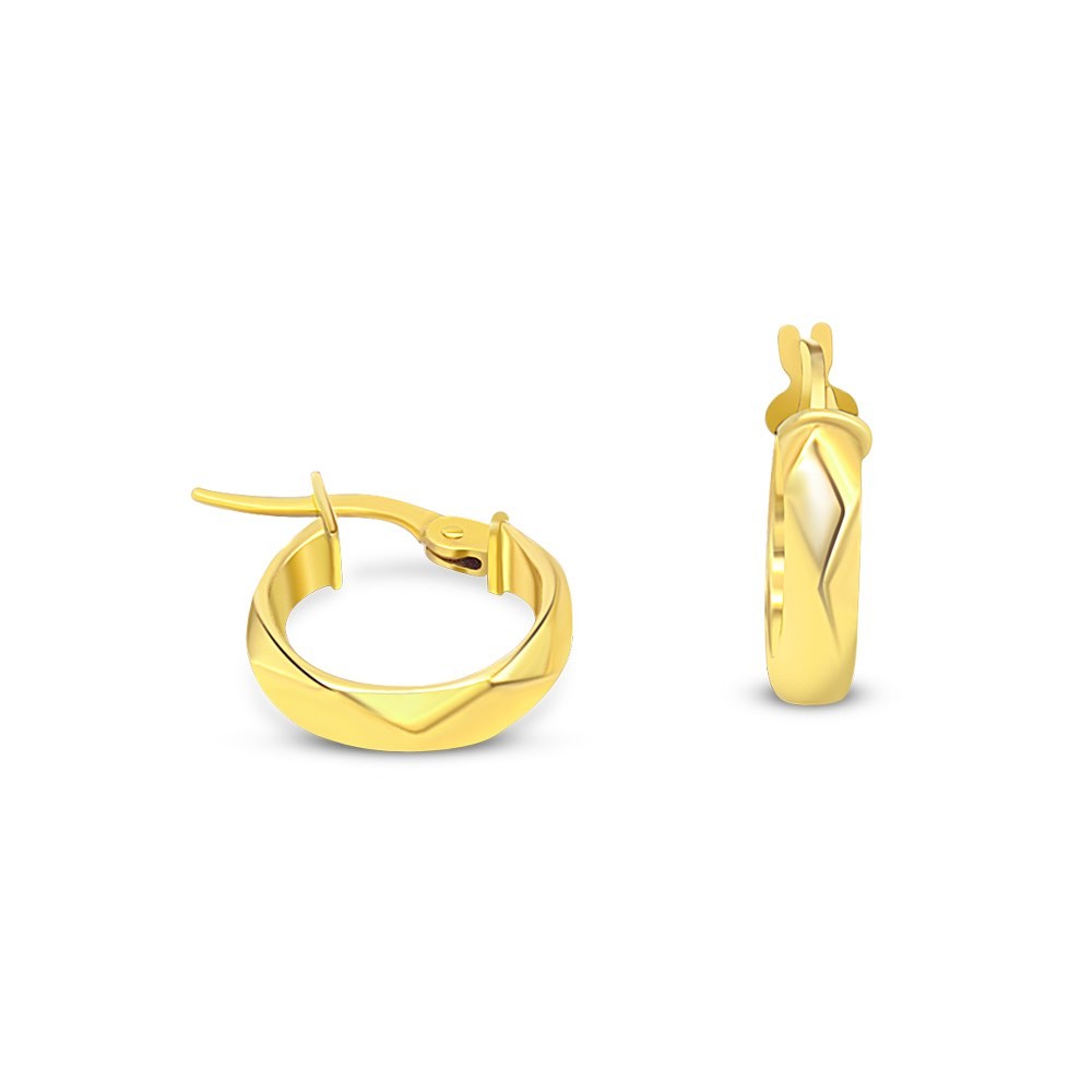 Kruhové náušnice vyrobené zo 14 karátového zlata, s geometrickým, trojuholníkovým vzorom po celej ploche.