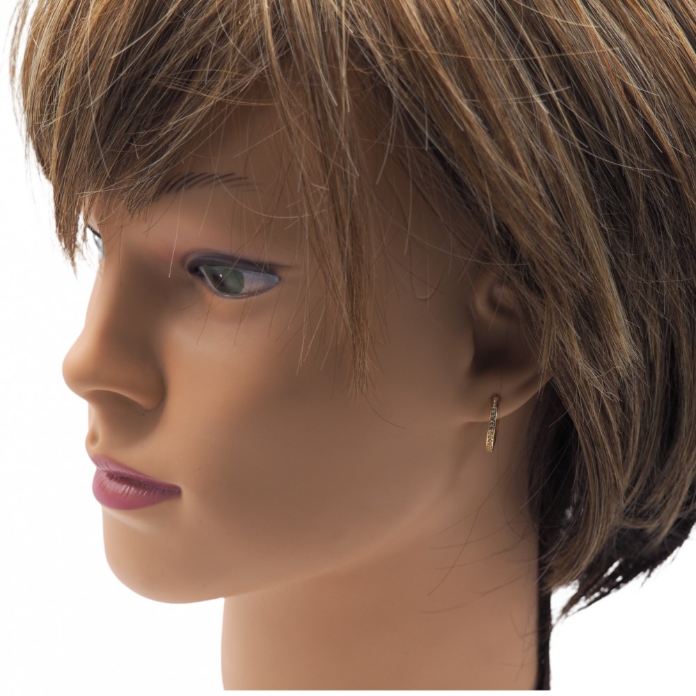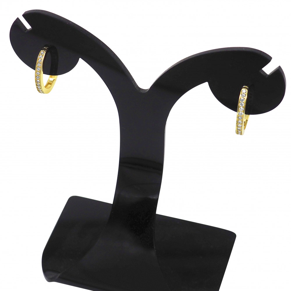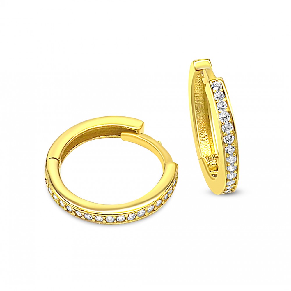 Kruhové náušnice zo 14 karátového zlata, zdobené kryštálmi do polovice kruhu. Trblietavý kúsok, elegantné, ale decentné nosenie.