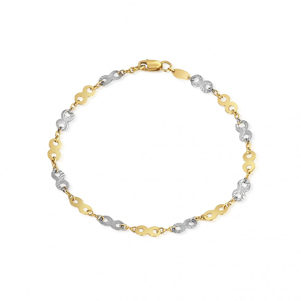 Náramok zo 14 karátového zlata, bieleho zlata a trblietavého zlata so vzorom osmičky v striedavých farbách.