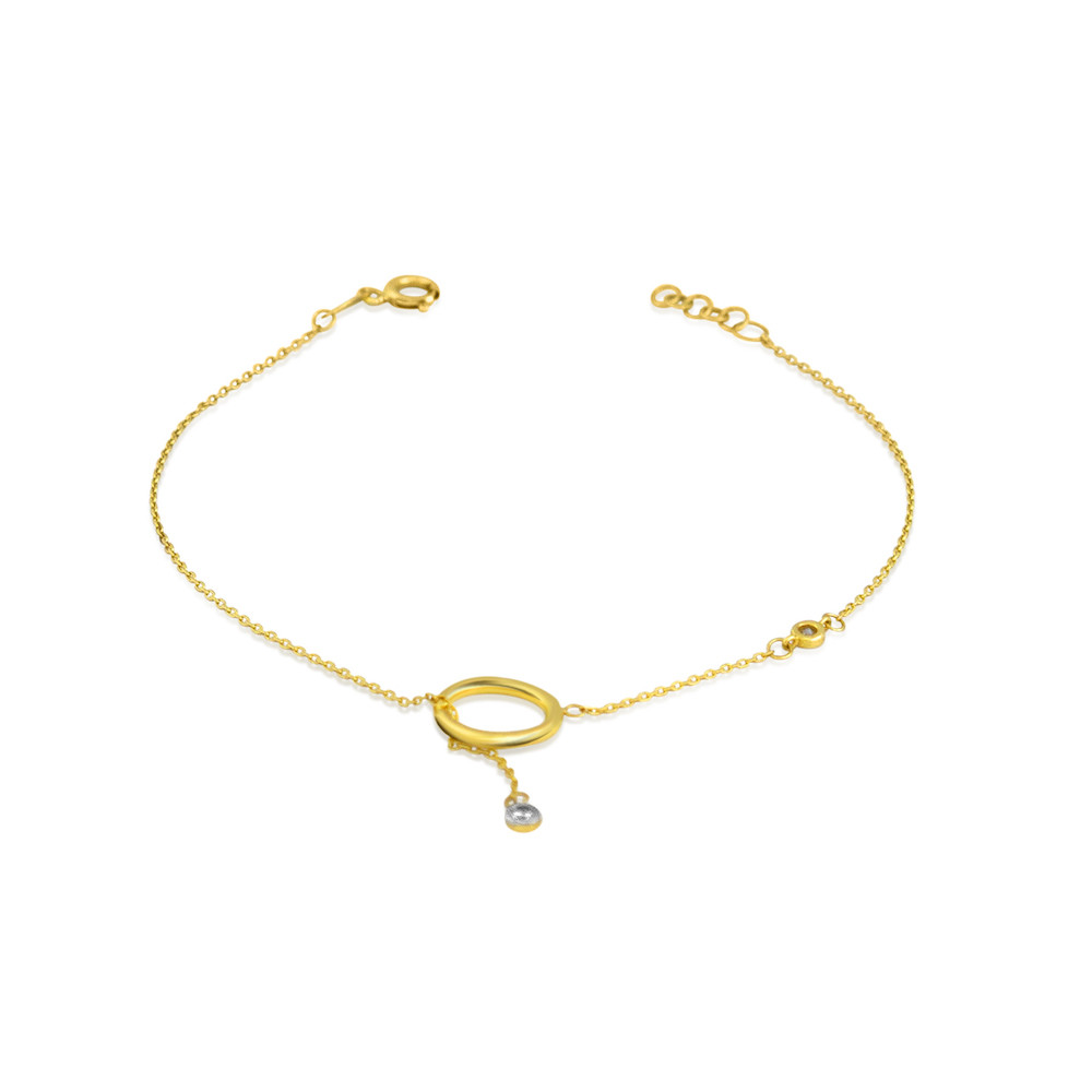 Náramok zo 14 karátového zlata s prsteňom v strede a dvoma trblietavými kryštálmi.