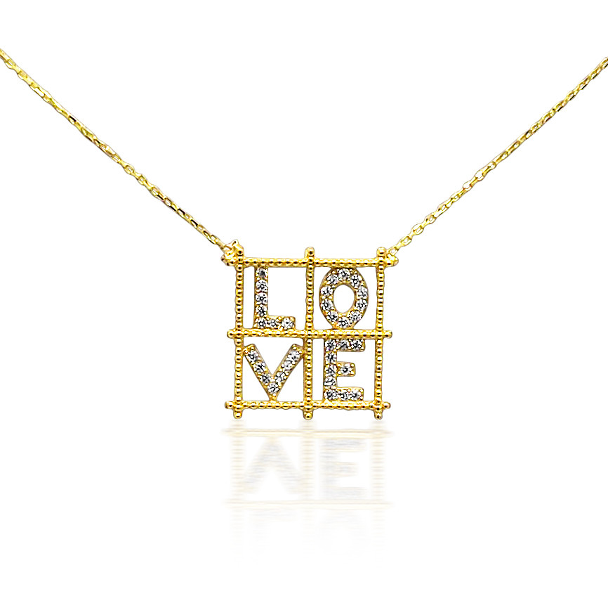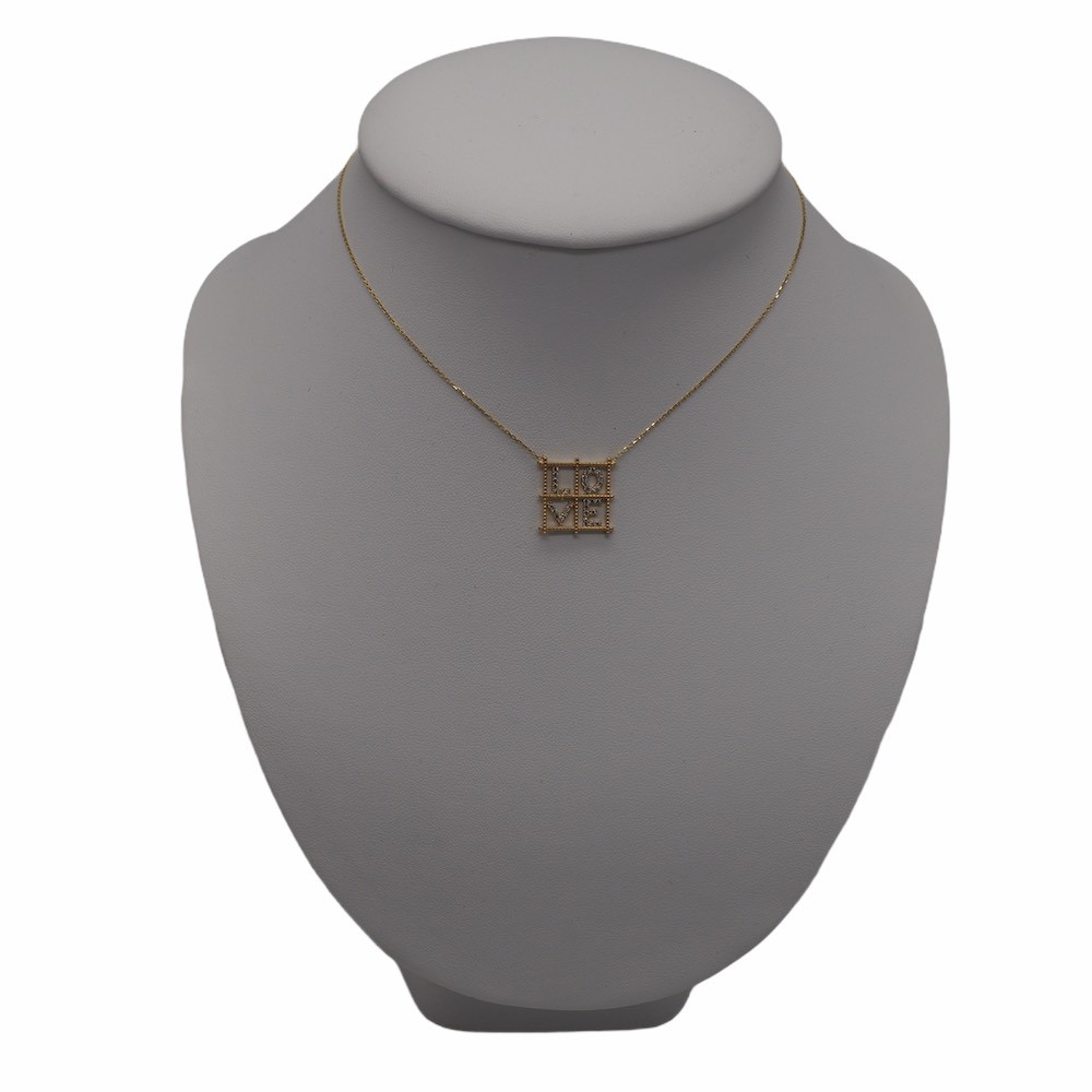 Náhrdelník zo 14 karátového zlata so štvorcovým príveskom s nápisom LOVE.