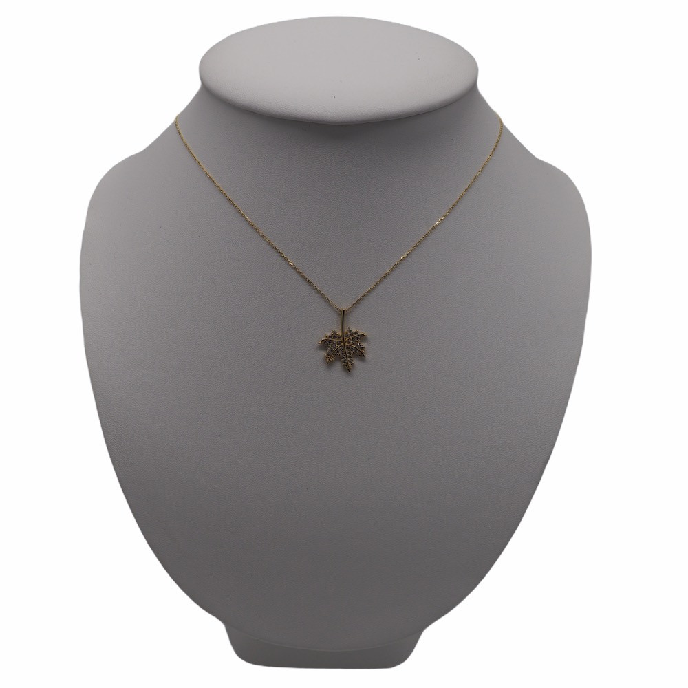 Náhrdelník zo 14 karátového zlata, s príveskom z javorového listu zdobeným kryštálmi.
