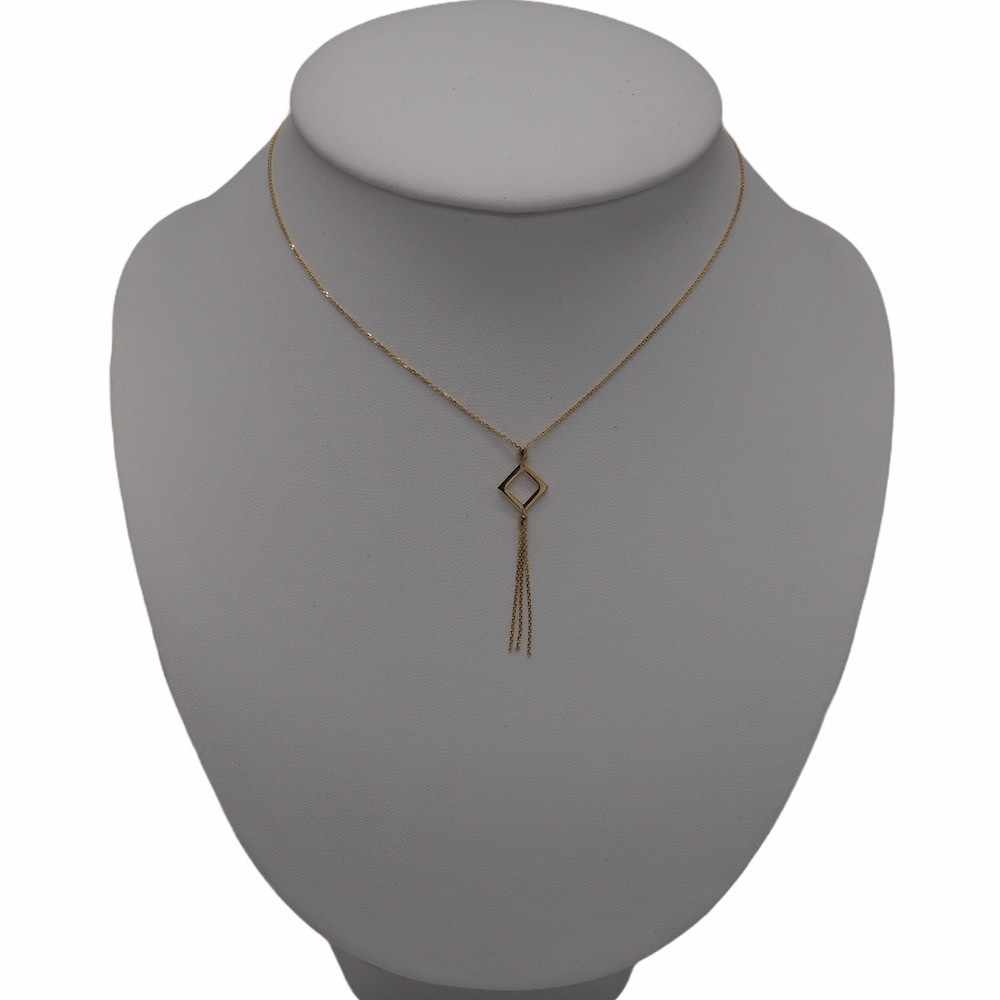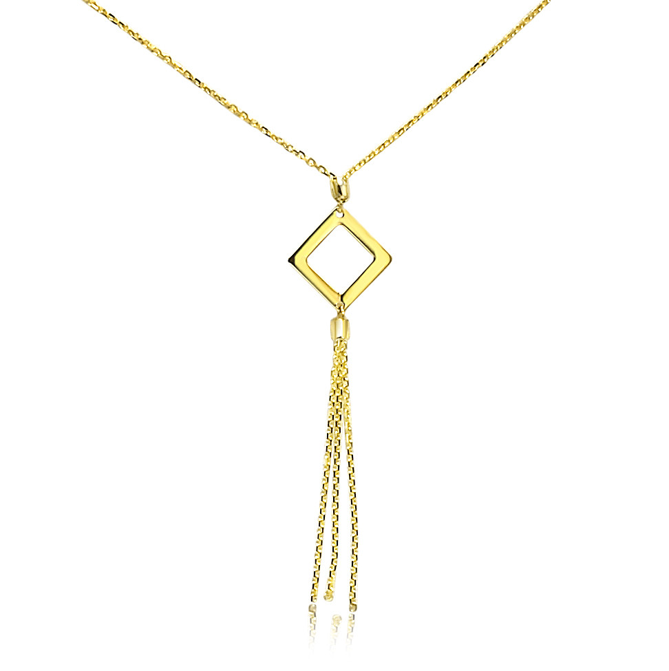 Náhrdelník vyrobený zo 14 karátového zlata so štvorcovým príveskom na okraji, ktorý je zdobený elegantnými retiazkovými kúskami prívesku a tým dodáva jedinečný vzhľad.