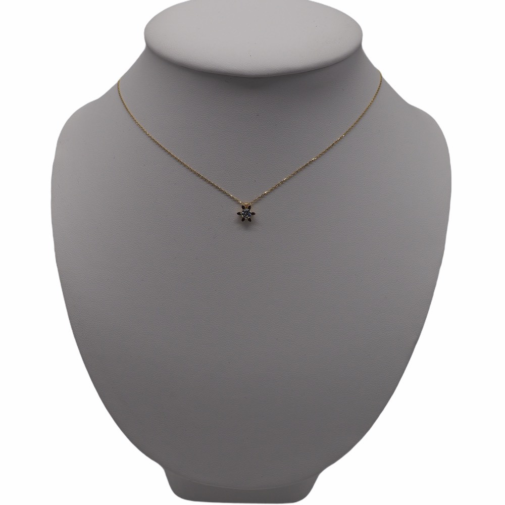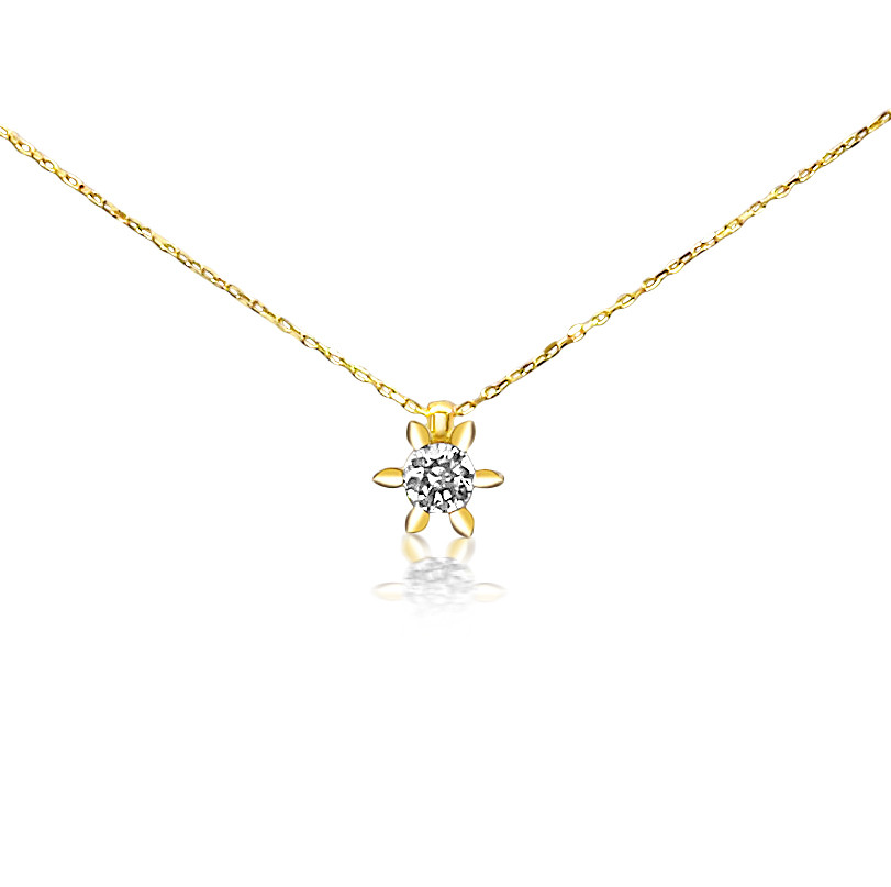 Náhrdelník zo 14 karátového zlata zdobený kryštálmi a príveskom s kvetinovým vzorom.