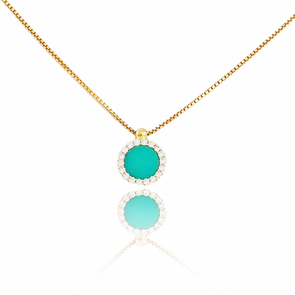 Náhrdelník zo 14 karátového zlata s okrúhlym zeleným kryštálom obklopeným trblietavými kryštálmi kubického zirkónu.