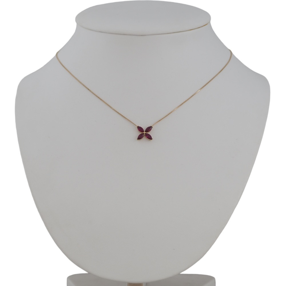 Náhrdelník zo 14-karátového zlata s červeným krištáľovým príveskom zobrazujúcim štvorlístok kvetu.