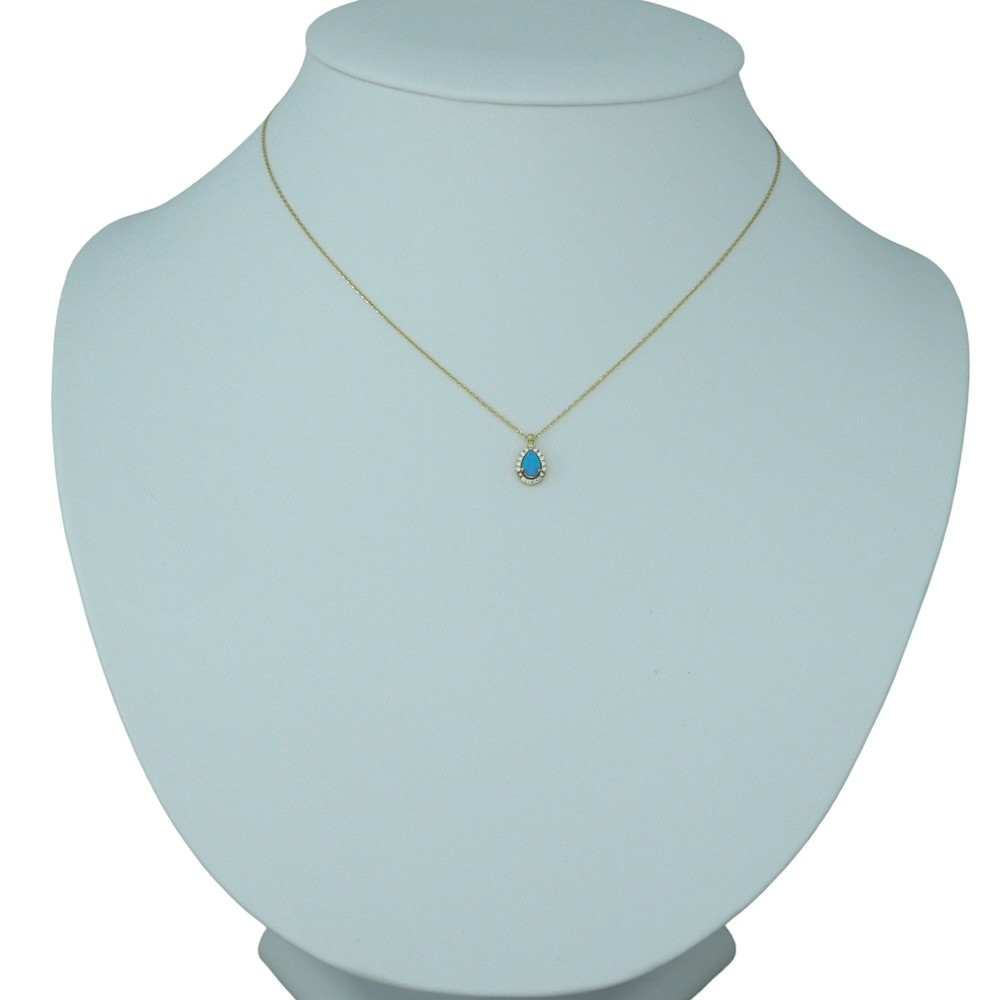 Náhrdelník zo 14-karátového zlata s opálovým tyrkysovým kryštálom v tvare kvapky, zdobený kryštálmi zirkónu v kruhu.