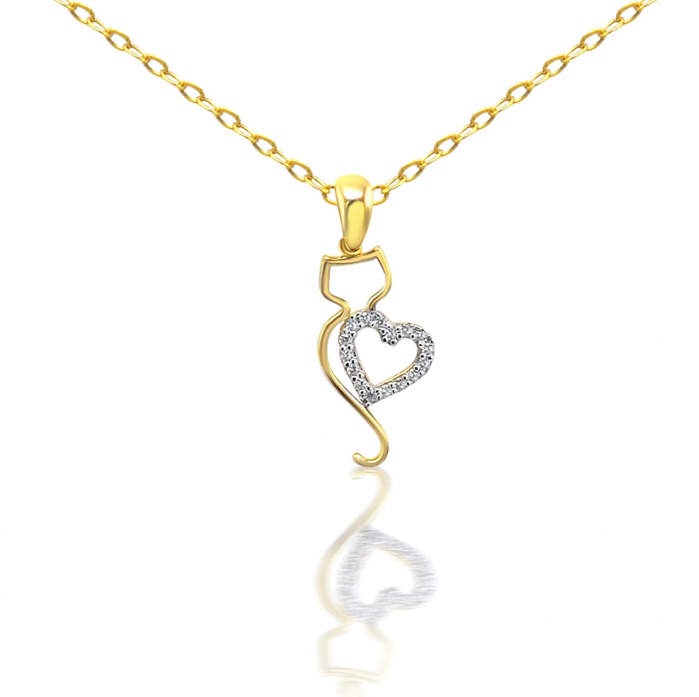 Prívesok zo 14 karátového zlata s mačičkou a krištáľom zdobeným vzorom srdca.