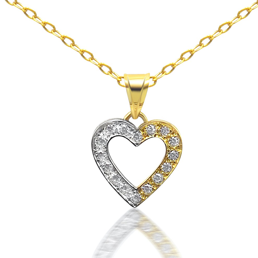 Dvojfarebný prívesok srdiečko zo 14 karátového zlata zdobený kryštálmi.