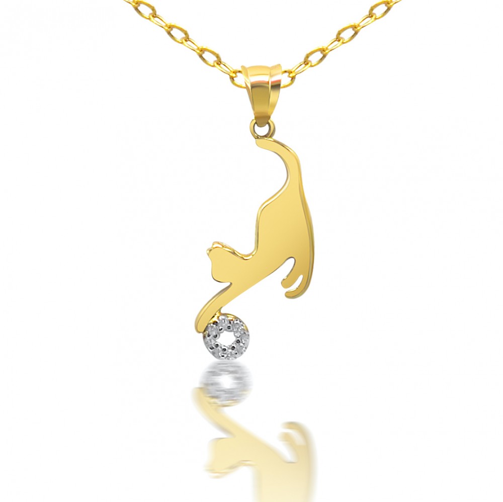 Prívesok mačka zo 14 karátového zlata hrajúca sa s pradienkom.