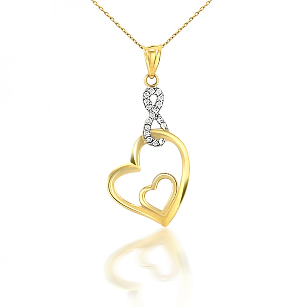 Prívesok zo 14 karátového zlata, znázorňujúci symbol nekonečnej lásky, s krištáľovým zdobením.