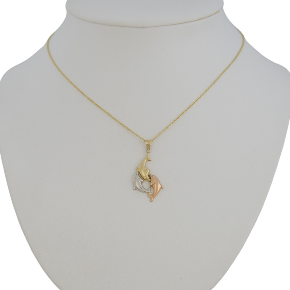 Trojfarebný prívesok vyrobený zo 14 karátového zlata, na ktorom sú vyobrazení traja delfíni. Veľmi vkusná farebná kombinácia bieleho zlata, ružového zlata a žltého zlata.