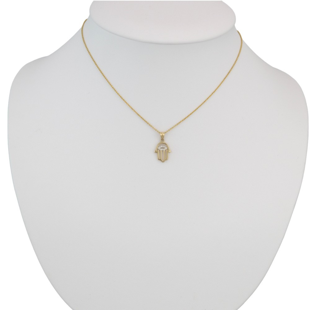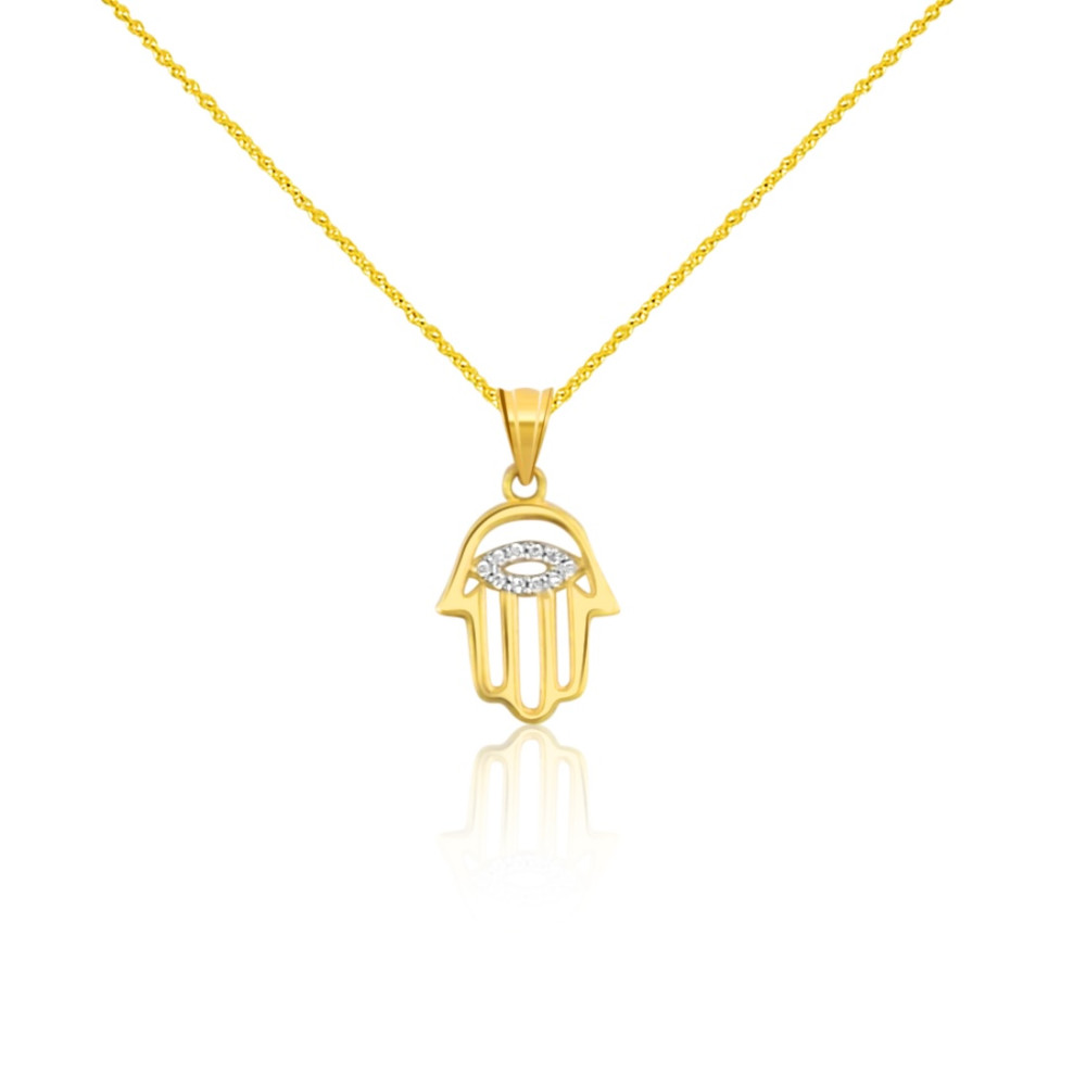 Vyrobený zo 14 karátového zlata, prívesok Ruka Fatimy, zdobený kryštálmi.