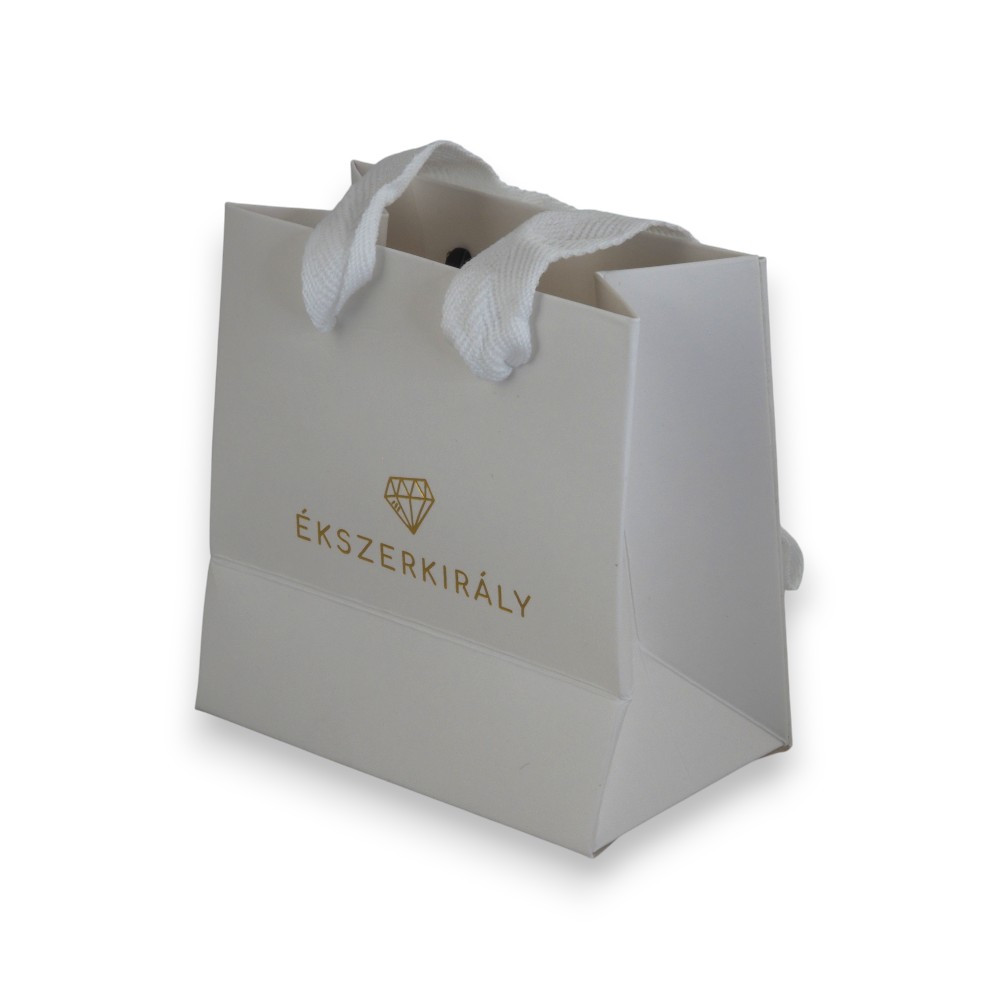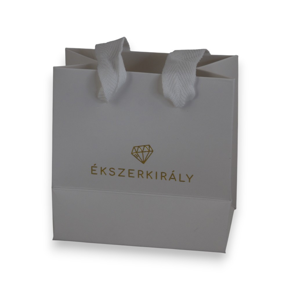 Stílusos, fényes, laminált, fehér prémium ajándéktáska arany Ékszerkirály logóval, mely méltó kiegészítője bármely ékszerajándéknak.