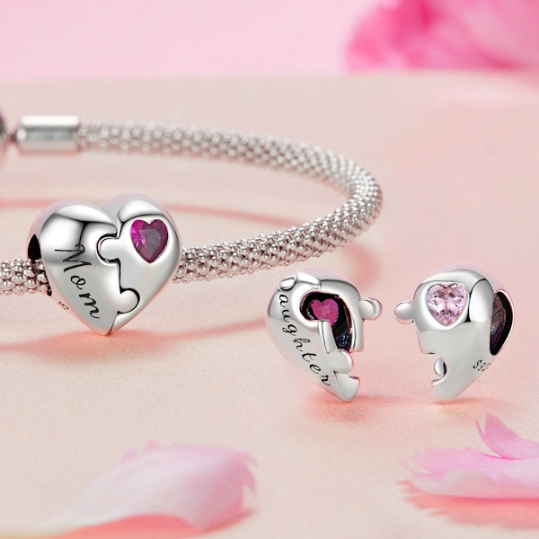 Ez az elbűvölő, szív alakú puzzle charm tökéletes választás, ha különleges kapcsolatot szeretnél kifejezni. A 925 sterling ezüstből készült darab finom cirkóniumkristályokkal van díszítve, amelyek ragyogást és eleganciát kölcsönöznek neki. A "Mom - Daughter" felirat nemcsak az anya-lánya kötelék erejét szimbolizálja, hanem minden pillanatot felejthetetlenné varázsol. Viseld karkötőn vagy nyakláncon, hogy mindig emlékeztessen a szeretetre és összetartozásra. Mérete ideális, így nemcsak esztétikus, de kényelmes viselet is. Ajándéknak is kiváló, hiszen ki ne örülne egy ilyen különleges és érzelmes ékszernek?