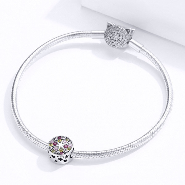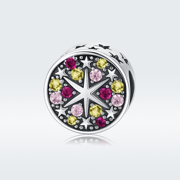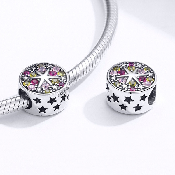 Ismerd meg az elegancia új szintjét az ezüstcharm csillagokkal díszített ékszerrel, amely minden megjelenésedet varázslatossá teszi. A 925 sterling ezüstből készült charmot színes cirkóniumkristályok díszítik, amelyek lenyűgöző ragyogást kölcsönöznek neki. A finom kidolgozás és az 1x1 cm-es méret tökéletesen illeszkedik bármilyen karkötőhöz vagy nyaklánchoz, így minden alkalomra ideális választás.