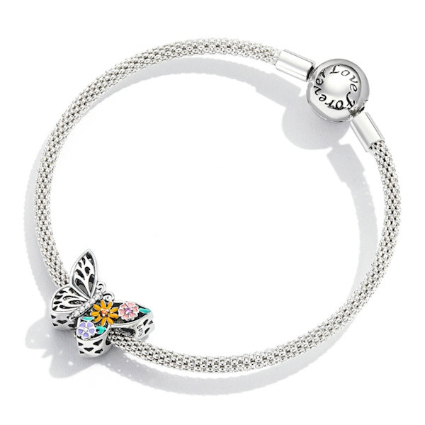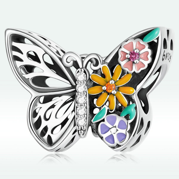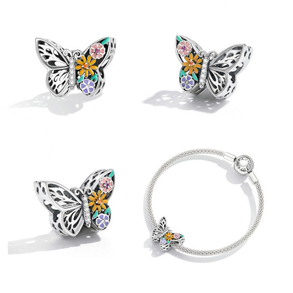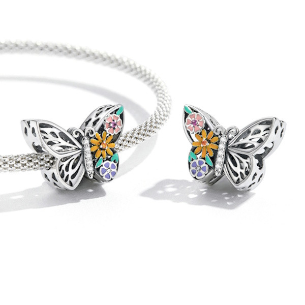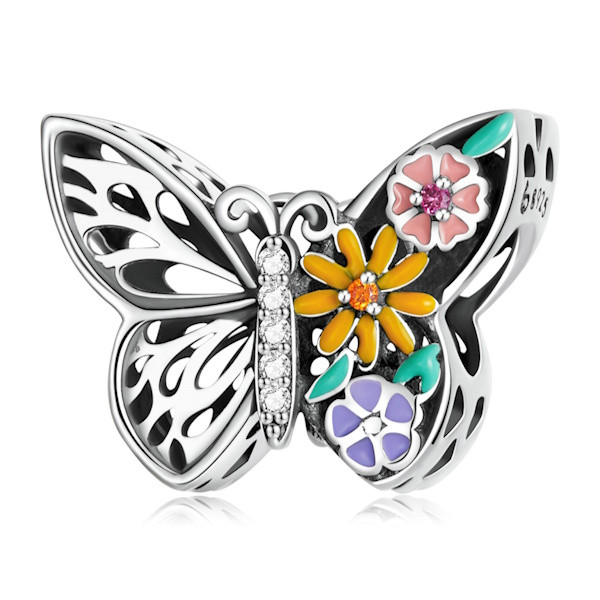 Engedd, hogy ez az elbűvölő ezüst charm, színes pillangó formában a mindennapjaid részévé váljon. A 925 sterling ezüstből készült, zománccal és csillogó cirkóniumkristályokkal díszített ékszer igazán különleges kiegészítője lehet karkötődnek vagy nyakláncodnak. A finom részletekkel megalkotott pillangó képes megragadni a tekintetet, miközben különleges színei vidámságot és eleganciát sugároznak.