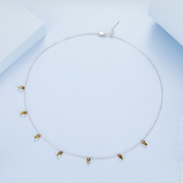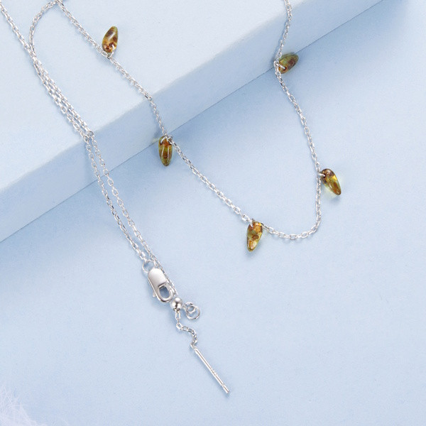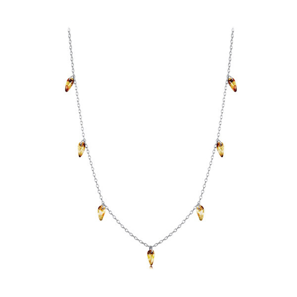 Ez az elegáns ezüst nyaklánc finom borostyánszínű üveggyöngyökkel díszítve igazi különlegesség. A 925 sterling ezüstből készült láncot fehérarany-bevonat fedi, ami nemcsak a csillogását emeli ki, hanem tartósságát is növeli. A csepp alakú gyöngyök különleges, áttetsző hatást kölcsönöznek neki, így minden alkalomra tökéletes választás.