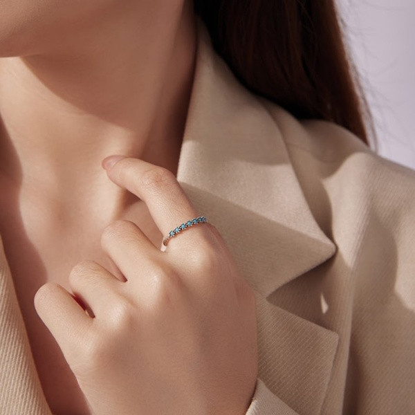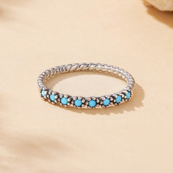Oxidált ezüstből készült női gyűrű szintetikus türkizzel. Szélessége 0.16 cm, súlya 1.2 g.